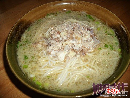 9、奶汤面 奶汤面起源于四川邛崃,因面汤如奶而得名。店家在头天晚上将猪骨、鸡骨放进锅里,用微火熬煮,一直熬到清晨,汤由清变白咸了奶状。此时,一掀锅盖,那缕缕的香气就会扑鼻而来。用这种奶汤煮面,加上鸡丝、酸菜肉丝等臊子,吃起来非常可口。