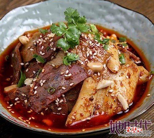 4、夫妻肺片 夫妻肺片实为牛头皮、牛心、牛舌、牛肚、牛肉,并不用肺。夫妻肺片片大而薄,粑糯入味,麻辣鲜香,细嫩化渣。