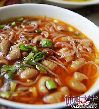 3、肥肠粉 肥肠粉历来是成都众多小吃中最有特色的品种之一,其麻辣鲜爽,色红味美,配上特色的拌肥肠既可作为小吃品味,也可权作特色一餐。肥肠粉完全具备“快餐”的特点。