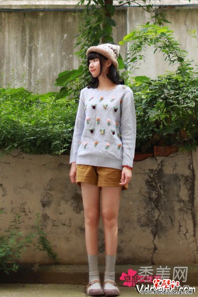 秋日必穿的针织款式你准备好了吗,这款浅色的清新毛衣针织款式,很适合秋日的街头装扮。甜美的球球装饰更有日系风,下面搭配上一款灯芯绒的短裤款式,百搭的姜黄色和浅灰色的袜子很搭调,配上一顶毛线针织帽子更小清新。