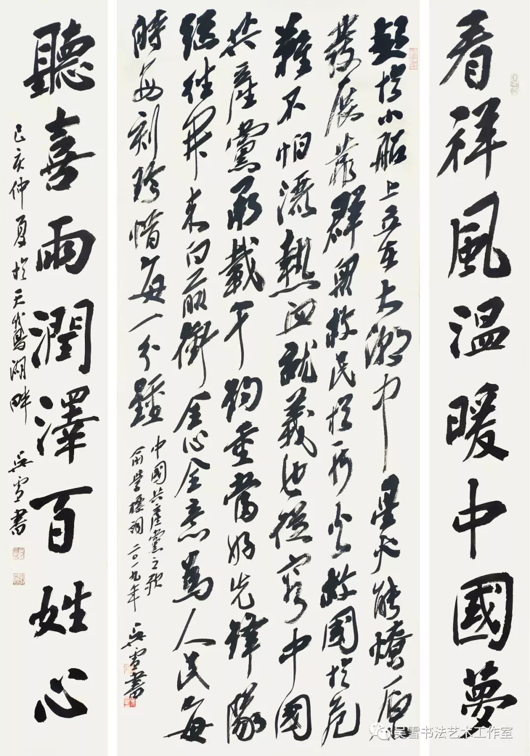 展厅现场 榆林,你好 ——写在吴雪书法展前面的话 你好,榆林!这是一个来自老庄故里,带着徽风皖韵的安徽朋友对您的问候。 你是一块古老的土地,是一个英雄辈出的地方。 春秋上郡,兴于明清。两守孤城,千秋忠勇。杨家将一门忠烈,精忠报国,铸就爱国丰碑。 你是一个充满活力并不断创造奇迹的城市。听听名字就让人浮想联翩。神木,府谷,定边,靖边。背后有多少故事,令人神往。中国的科威特,让埋藏于地下的宝藏正焕发出能量和光芒。四通八达的立体交通,正连接大江南北,长城内外。新时代为榆林插上了腾飞的翅膀。让世人刮目,让榆林自豪,让世界期待。 你还是那样的美丽,那样的豪放。“遥想故人投宿地,画船应在碧榆林。”金秋的榆林,漫山碧透,层林尽染。生物的多样性把榆林打扮得婀娜多姿,分外妖娆。米脂的婆姨,绥德的汉,陕甘宁边区的红色故事,陕北道情唱也唱不完。 我们为榆林自豪,为榆林放歌,为榆林祝福。 榆林,你好!这是安徽朋友对您的诚挚邀请。 老庄大道,徽乡淳厚。黄山奇伟,江淮灵秀。桐城派续写文脉,新文化独领风骚。大别山扛起红一军旗,小岗人敢为天下先。而今,量子卫星,科大讯飞,国家科技中心助推安徽跨越发展。勤劳智慧的江淮儿女正鼓满风帆,谱写改革创新的壮丽篇章。安徽欢迎你,安徽等你来。 携手新时代,共书中国梦。书写时代是我们的责任,讴歌人民是我们的使命。这是一次文化之旅,也是艺术的表达,更是一个书法工作者对美好未来的祝愿。不断满足人民对美好生活的新期待,永远在路上。 祝福榆林,感恩时代,共筑梦想…… 展览作品欣赏 时代情怀