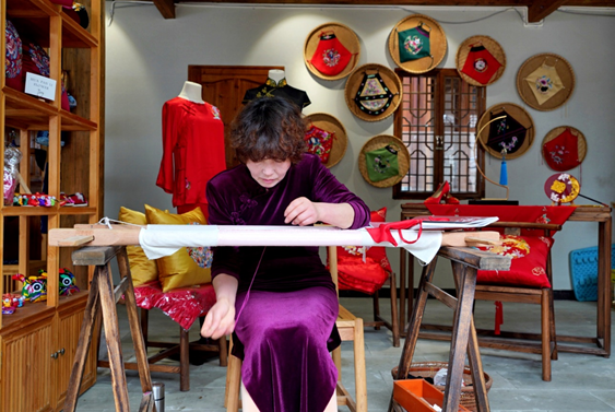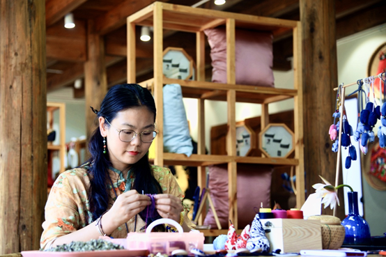 活,非遗技艺在现场 泥金彩漆是十里红妆文化里的瑰宝,金缮修补瓷让器物焕发新生。两项难得一见的传统技艺在书院现场演绎,把文化气息渲染进了古镇的骨子里。 色,绣染编织画团扇 绣娘的飞针走线,娃娃的五色肚兜; 婷婷的手工香囊,花色繁多技法高超,包裹进端午的内涵,散发出自然的芬芳;扎染的青布更是达到了胜于蓝的效果。